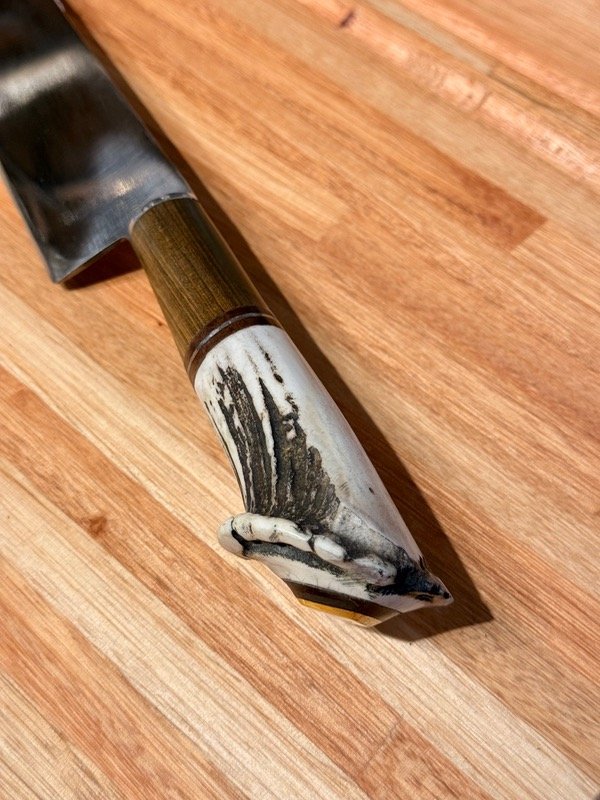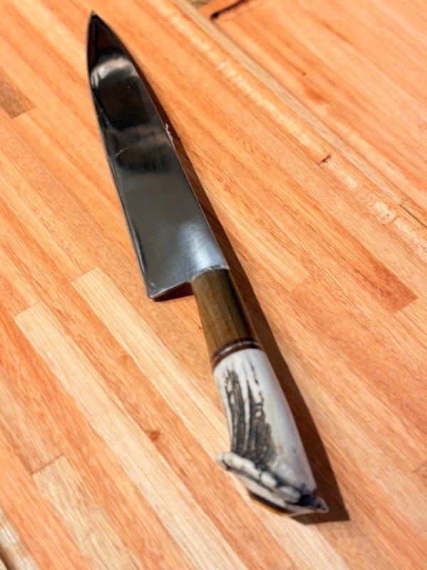 Cuchillo de acero inoxidable de 20cm de largo y mango de asta de ciervo. Más liviano que el acero al carbono y disco de arado. Mantiene el brillo, tiene alta resistencia a la corroción y por lo tanto bajo mantenimiento.