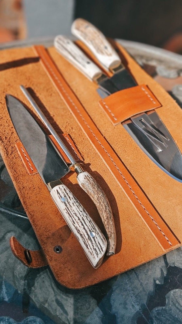 Chaira, y estuche de cuero crudo. Los mangos están confeccionados en asta o madera con botón de bronce